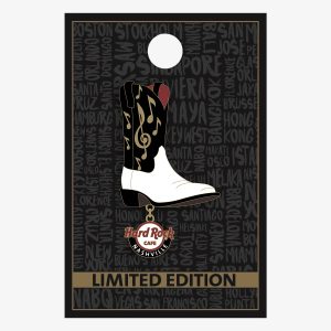 Straight out of the frontier and into the spotlight, the Hard Rock Online Exclusive Collectible Chained Cowboy Boot Pin Series brings Western style to the enamel pin world with striking detail. This collectible features a tall white cowboy boot with a black heel, red interior, and a gold trail of music notes rising along the…