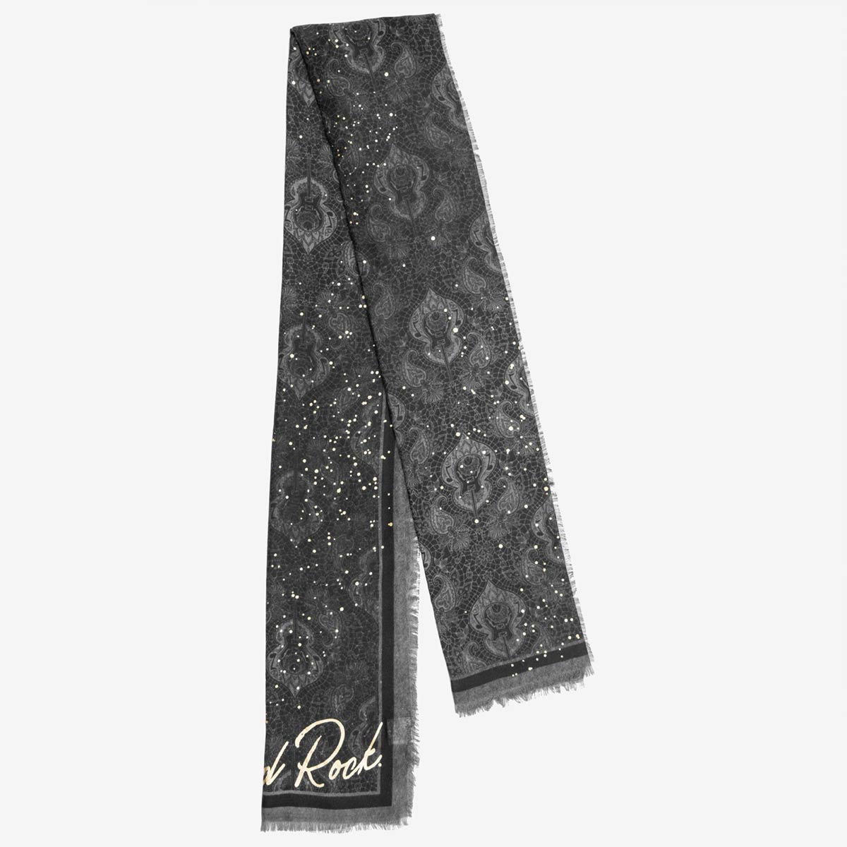 Shop the Black Paisley Foil Guitar Scarf, designed with intricate paisley patterns and metallic guitar accents. This black scarf is a must-have accessory for adding texture and a hint of shimmer to casual or concert-ready outfits.