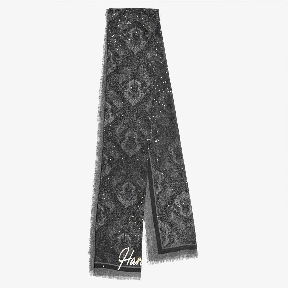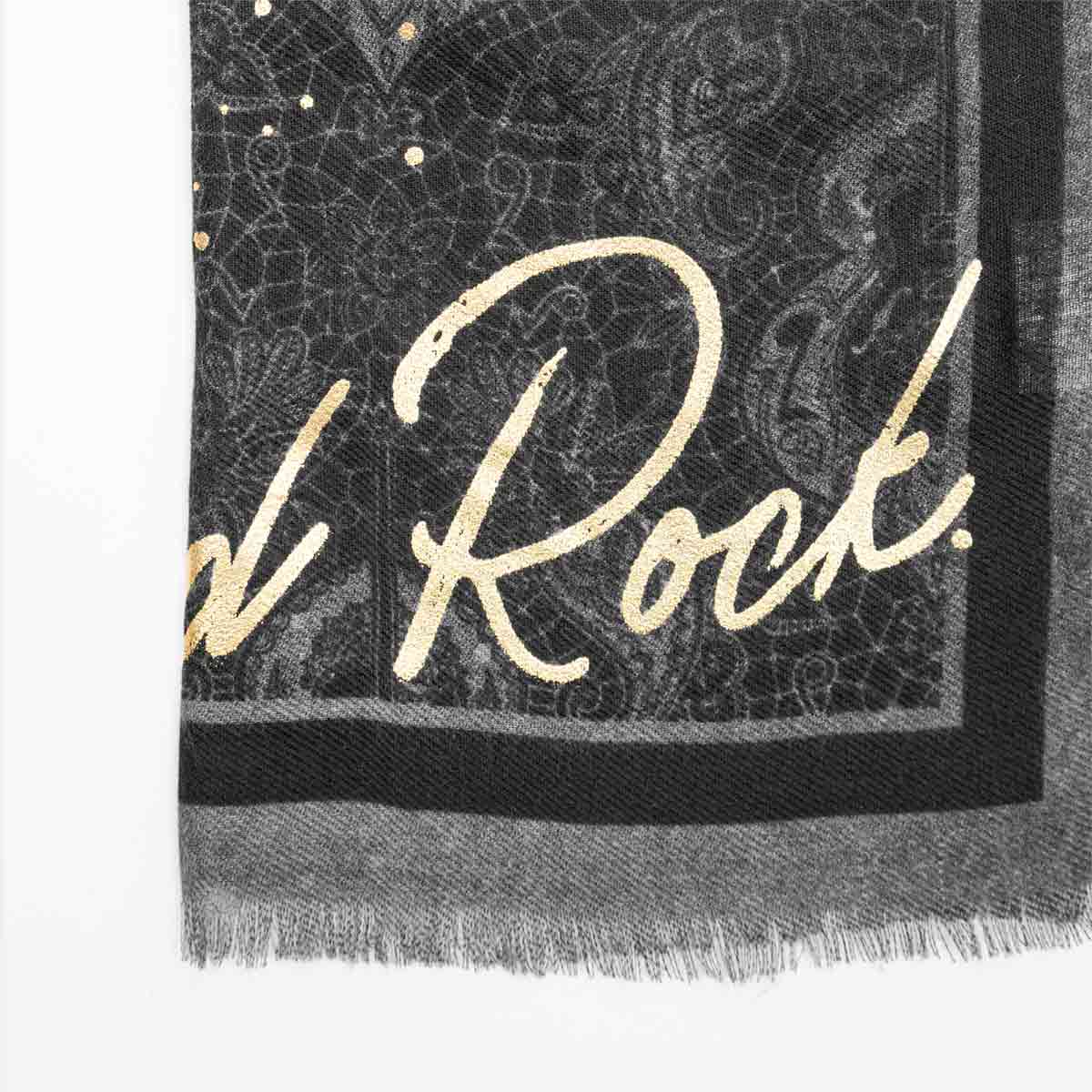 Shop the Black Paisley Foil Guitar Scarf, designed with intricate paisley patterns and metallic guitar accents. This black scarf is a must-have accessory for adding texture and a hint of shimmer to casual or concert-ready outfits.