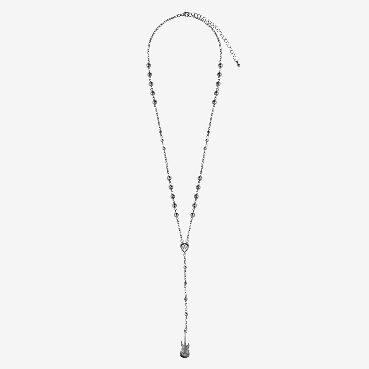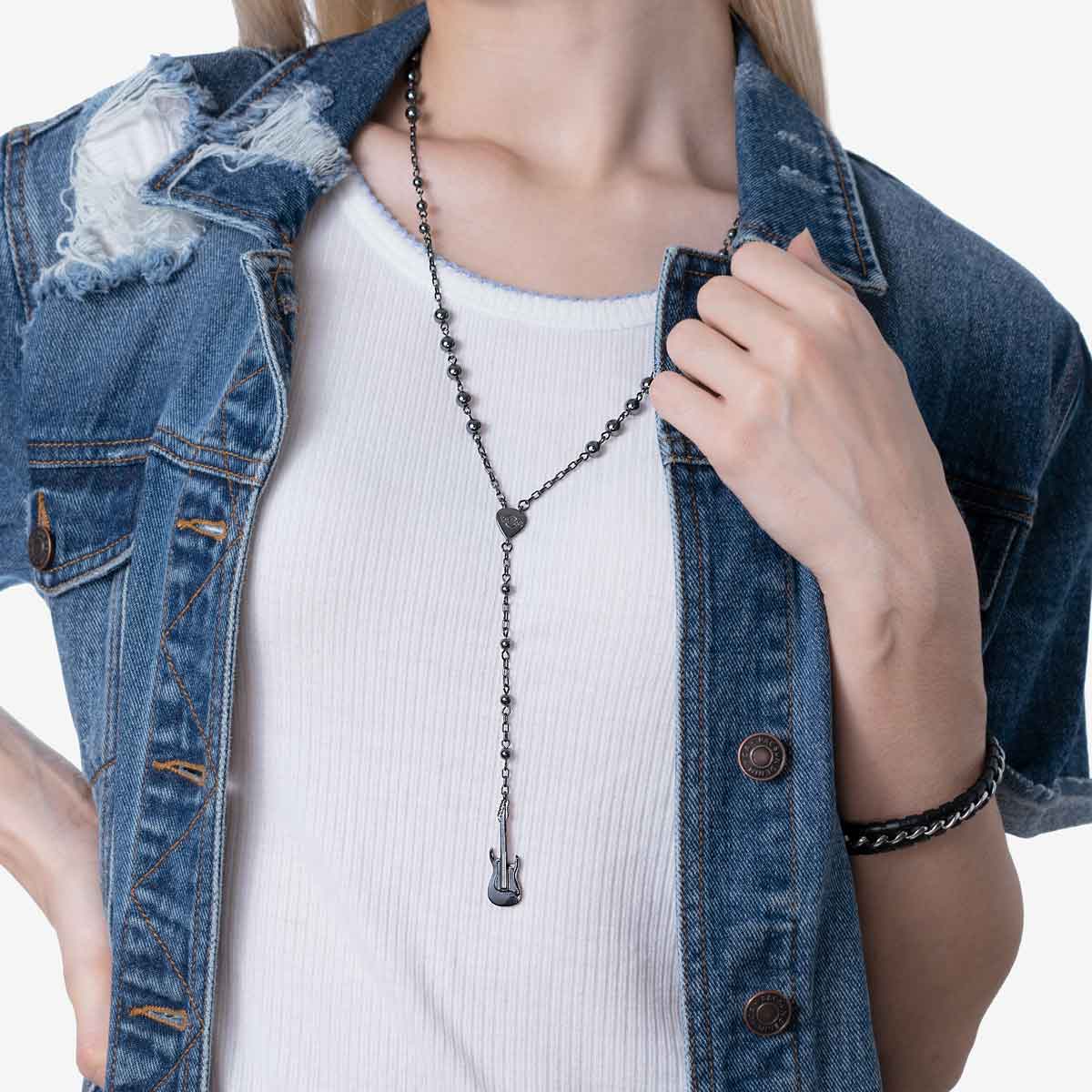 Guitar Pendant Rosary Necklace in Gunmetal Tone Keep music close to you with this pendant Rosary. Subtle yet bold, can be worn with various looks. Featuring a guitar pendant and pick nestled on a beaded link chain combo necklace.